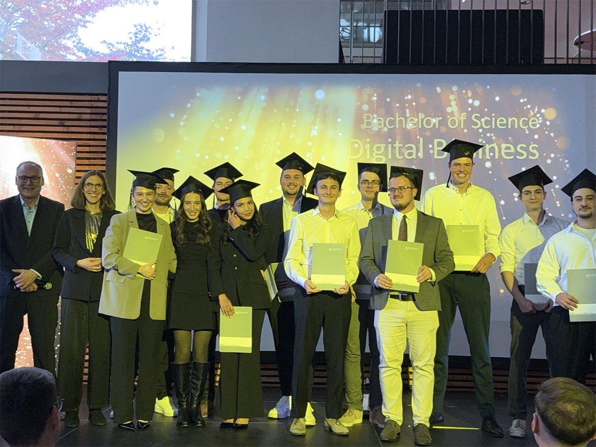 Der feierliche Festakt wurde durch inspirierende Reden begleitet. Besonders hervorgehoben wurden die Semesterbesten, die für ihre herausragenden Leistungen ausgezeichnet wurden. Ein weiterer Höhepunkt des Abends war die Verleihung der Herman Hollerith Thesis Awards in den Studiengängen Digital Business (DIB), Digital Engineering (DBE) und in dem berufsbegleitenden Masterstudium Digital Business Management (DBM). Alle prämierten Abschlussarbeiten überzeugten durch Innovationskraft und Praxisrelevanz und spiegeln die hohe Qualität des Studiums am HHZ wider.