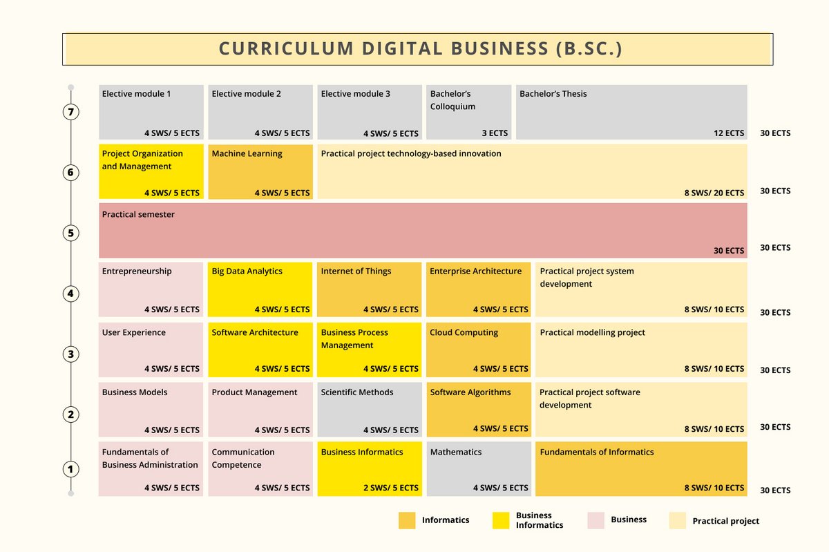 The Digital Business degree course is a specialized sub-area of business informatics and focuses on digital transformation. The course combines highly topical subjects from the fields of business informatics and economics. Important fundamentals are taught in the first semesters before more interdisciplinary courses are offered in the later semesters.