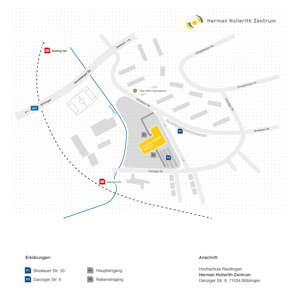 - Flug: Flughafen Stuttgart, S2/ S3 Richtung Innenstadt bis Haltestelle „Rohr“, S1 Richtung Herrenberg bis Haltestelle „Böblingen“, dann wahlweise Fußweg bis zum HHZ (ca. 20 Minuten) oder SEV Bus bis Berliner Straße und dann Fußweg (ca. 8 Minuten) - Achtung: die Schönbuchbahn (R72) Richtung Dettenhausen bis Haltestelle „Böblingen Danziger Straße“.