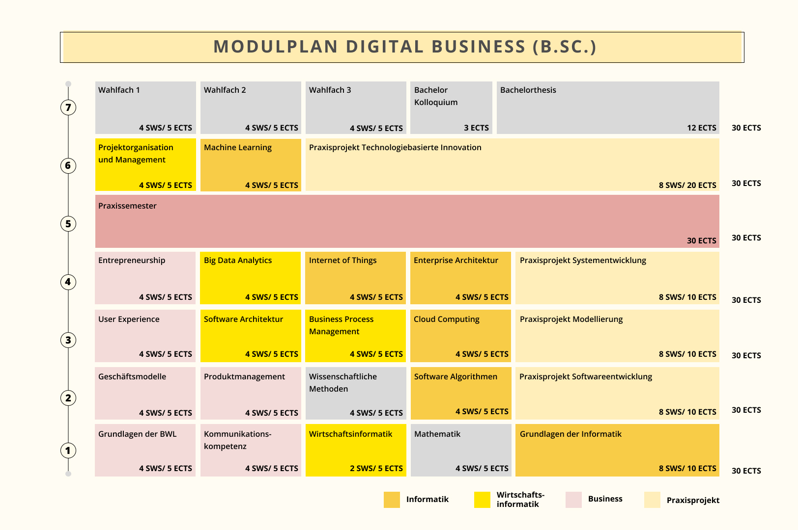 Die praxisorientierte Ausrichtung des Studiengangs zeigt sich insbesondere durch die Praxisphase im 5. Semester und die kontinuierliche Umsetzung projektorientierter Lehrveranstaltungen über alle Semester hinweg. „Learning by Doing“ ist hier das Motto. So lernst Du im Praxisprojekt Entrepreneurship bei, Deine eigene Vision zu verwirklichen. Abgerundet wird das Programm durch Wahlfächer, die Dir die Möglichkeit einer Vertiefung bieten, und die Bachelorthesis.
